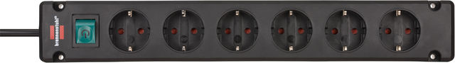 Bremounta stekkerdoos, met randaarde, 6-voudig zwart H05VV-F 3G1,5 * Aantrekkelijk design. * Stopcontacten in een hoek van 90°. * Uitstekend geschikt voor aansluiting van haakse stekkers. * De afstanden vergemakkelijken het gebruik van netapparaten. * Verlichte veiligheidsschakelaar, tweepolig in-/uitschakelbaar. * Optimaal te bevestigen via schroefgaten, voor vlotte montage van de stekkerdoos op bv. een wand. * Stopcontacten met hogere contactbescherming. * Kabellengte: 3 meter. 1 stuk