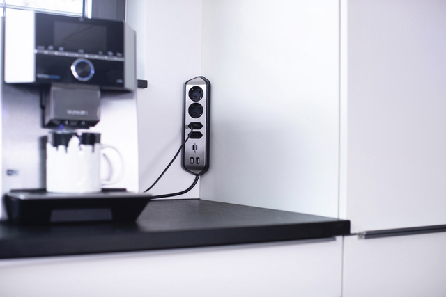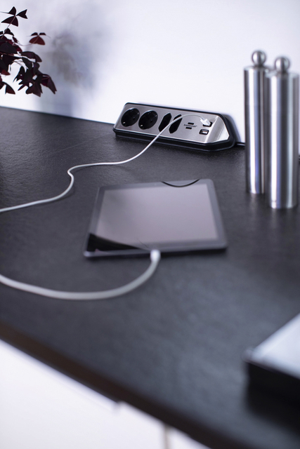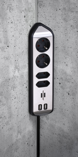 * De compacte brennenstuhl®estilo, met randaarde, hoekstopcontact van zeer breukvast kunststof en hoogwaardig roestvrij stalen oppervlak brengt orde in uw huis. * De universeel bruikbare contactdoosstrook kan eenvoudig worden bevestigd als stekkerdoos voor uw werkblad of als tafelcontactdoosstrook voor uw werkplek met behulp van speciale zelfklevende pads. * De keuken- of tafelcontactdoosstrook kan horizontaal of verticaal worden gemonteerd. * Kabellengte 2 meter. * Kabelaanduiding: H05VV-F 3G1.5. * Met hogere contactbescharming. * 2 contactdozen in 45°-opstelling. * 2 Euro stopcontacten in 90° opstelling. * 2 USB-Lader. * Dit product is niet geschikt voor de Belgische markt. 1 stuk