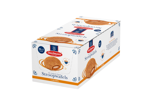 * De enige echte stroopwafels van Daelmans, gemaakt met alleen de beste ingrediënten. * Elke stroopwafel bestaat uit twee dunne laagjes verse wafel, met daartussen een overheerlijke rijke stroopvulling. * Lekker voor tussendoor of onderweg. * Eén stroopwafel heeft een diameter van 9cm. * Display doos met 36 per stuk verpakte jumbo karamel stroopwafel. * Probeer ook de andere producten uit het assortiment.