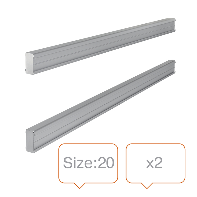 * Van natuurlijk geanodiseerd aluminium. * Geleverd in sets van twee, om de T-kaartplanpanelen zowel boven als onder te bevestigen. * De panelen klikken vast in de wandgeleiders. * Inclusief twee titelstrips. * Kleur: zilver. * Maat 20.
