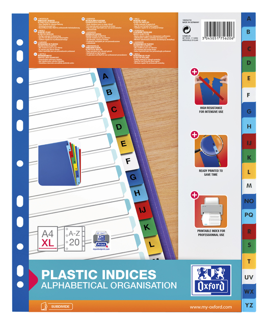 * A4-tabbladen van gekleurd kunststof. * Breng eenvoudig orde aan in een map met verschillende onderwerpen of hoofdstukken. *De 20-delige tabbladen hebben verschillende kleuren, zijn voorzien van A-Z. * Hebben een stevig kartonnen voorblad met bedrukking. * Dankzij het A4 XL formaat kan het gebruikt worden in combinatie met showtassen. * De tabbladen hebben 11 gaten en zijn daarmee in diverse ordners en ringbanden te gebruiken (o.a. 2-rings en 4-rings). * Gemaakt van 120mµ polypropyleen.