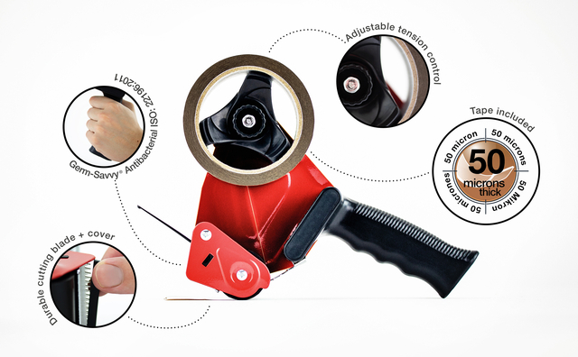 * De Rapesco 960 Tape Dispenser maakt licht werk van alle zware klussen en verpakkingstaken. * Deze sterke, handige dispenser heeft een stalen constructie en een gebruiksvriendelijke, slagvaste, voorgevormde handgreep met ergonomische pistoolgreep. * Met de ingebouwde Germ-Savvy® antibacteriële bescherming is de 960 perfect voor gezamenlijk gebruik. * Deze dispenser is voorzien van een instelbare tapespanningsregelaar en positie-/veiligheidsgeleider en is compatibel met alle soorten standaard verpakkingstape tot rollen van 50mmx60m. * Wordt geleverd met 1 rol bruine verpakkingstape van 50 mm x 50 m die op een groot aantal oppervlakken blijft kleven. * Dit model heeft 3 jaar garantie.