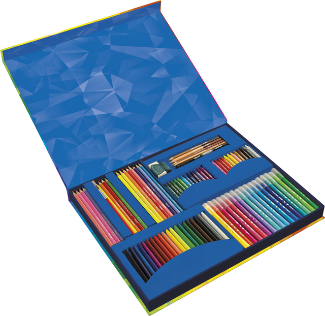 * Met deze uitgebreide kleurset maken kinderen de mooiste creaties. * Deze koffer bevat maar liefst 150 kleurproducten, waaronder 36 kleurstiften, 1 glitterstift, 36 kleurenpotloden, 3 duokleurpotloden in huidstinten, 12 pastelkleurpotloden, 24 Infinitypotloden en 24 waskrijtjes en dat alles in verschillende kleuren. * Dat is nog niet alles, natuurlijk is er ook gedacht aan de basisproducten: er is ook een waterbrushpen, 1 grafietpotlood, een gum en puntenslijper in deze mooie bewaarkoffer aanwezig.