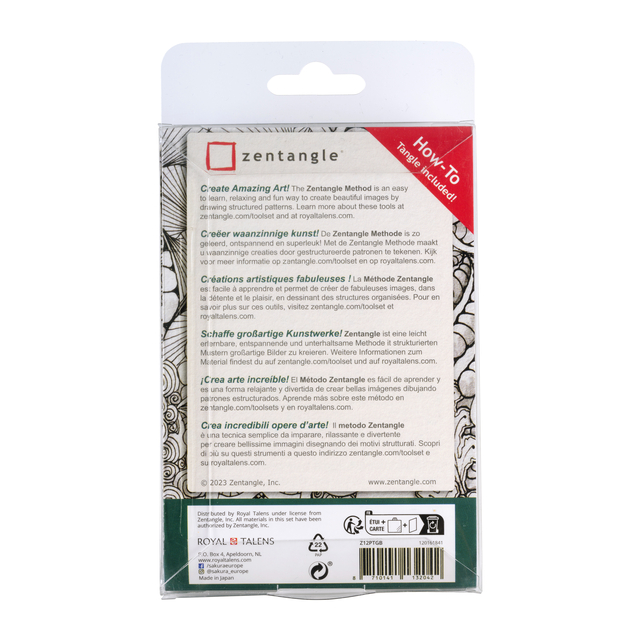 * Heb je al gehoord van de populaire nieuwe activiteit op hobbygebied? * Doe mee aan deze rage Zentangle! * Zentangle is een rustgevende tekentechniek. * Door simpele patronen te herhalen en te combineren maak je in een handomdraai je eigen bijzondere kunstwerkjes! * Het ziet er ingewikkeld uit, maar het is zo geleerd! Bekijk ook de nieuwe Zentangle tekenboeken! 1 set x 12 stuk