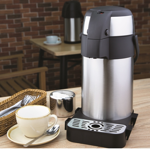 * Compact en zeer duurzaam met onbreekbare RVS binnen- en buitenkant. * Geschikt voor zowel warme als koude dranken. * Deze thermoskan met pomp van Olympia is perfect om allerlei dranken warm te houden en te serveren. Het dubbelwandige ontwerp houdt dranken tot wel 4 uur lang op temperatuur, waardoor u minder hoeft weg te gooien en u de kan minder vaak hoeft bij te vullen. Dankzij het dubbelwandige ontwerp blijft de buitenkant van de kan veilig koel en dankzij het eenvoudig te bedienen pompmechanisme kunnen gasten ook zelf makkelijk een drankje inschenken.