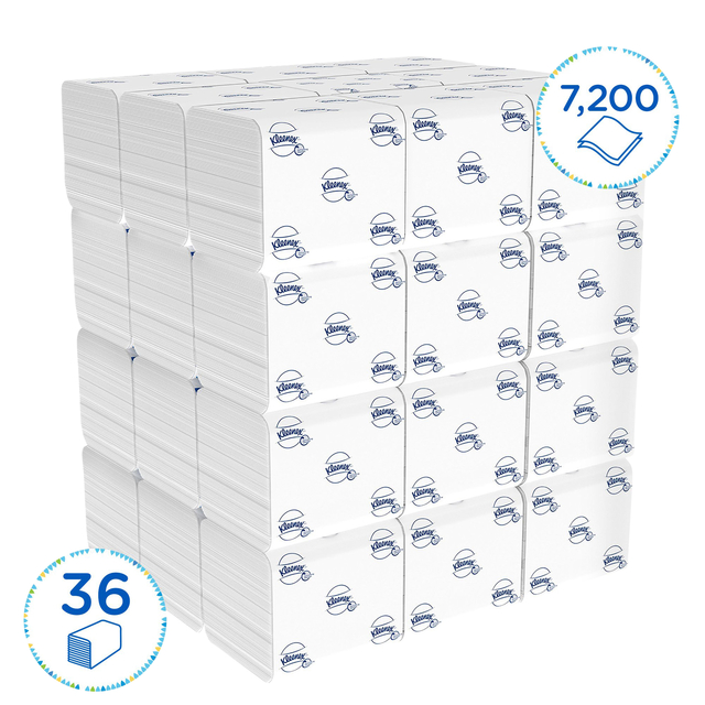* Kleenex gevouwen toiletpapier 8408 2-laags toiletpapier in bulkverpakking 36 pakken x 200 vellen ( 7200 vellen) * Maak uw ervaring in de toiletruimte aangenamer met het vertrouwde Kleenex®merk, ontworpen om een ongeëvenaarde ervaring te bieden en tegelijkertijd hoge hygiënestandaarden op de werkplek te ondersteunen. Het Kleenex® gevouwen toiletpapier biedt comfort net-als-thuis van een van de meest geliefde merken ter wereld. * Dit Kleenex® toiletpapier is bedrukt met een hoogwaardig logo in reliëf op de vellen gevouwen wc rol om uw gasten en medewerkers te laten zien dat u om hen geeft. Kleenex® 2-laags toiletpapier is zacht, voor een betere verzorging en een betere hygiëne in de toiletruimte. * Het slimme ineengevouwen ontwerp van dit onderling in elkaar gevouwen toiletpapier zorgt voor de afgifte van enkele vellen toiletpapier, waardoor er minder afval is en gebruikers alleen hoeven aan te raken wat ze gebruiken. * Onze aanraakvrije dispensers verminderen het risico van kruisbesmetting. * Compatibel met toiletpapierdispensers van Kimberly-Clark, inclusief diverse dispenseropties: Aquarius™ toiletpapierdispensers in wit of zwart (productcodes 6946 en 7172), een dispenser met hoge capaciteit (productcode 6990) en een roestvrijstalen dispenser met luxe uitstraling (productcode 8972). * Voor milieuzekerheid is dit Kleenex® toiletpapier in bulkverpakking FSC-gecertificeerd, voorzien van het Europees Ecolabel en goed doorspoelbaar.