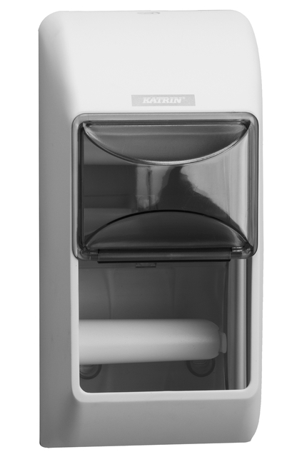 * Katrin toiletpapierdispenser voor 2 standaard rollen papier. * Praktische dispenser voor conventionele toiletrollen. * Geschikt voor 2 toiletrollen (inclusief luxe kwaliteitsrollen van 115 mm). * Gemaakt van ABS-kunststof Robuust en betrouwbaar. * Het inspectievenster geeft aan wanneer het tijd is om het papier bij te vullen. * Geschikt voor linker- en rechterhoek (omschakelbare rolhouder). * Eenvoudig te laden, installeren en onderhouden. * Afsluitbaar. * Afmetingen 145x300x145mm. * De sleutel zit geïntegreerd in de dispenser zelf. Voor montage moet deze uit de achterwand gedraaid worden,