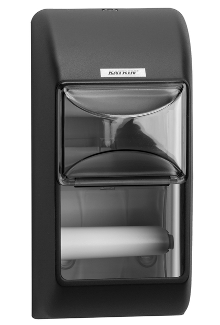 * Katrin toiletpapierdispenser voor 2 standaard rollen papier. * Praktische dispenser voor conventionele toiletrollen. * Geschikt voor 2 toiletrollen (inclusief luxe kwaliteitsrollen van 115 mm). * Gemaakt van ABS-kunststof Robuust en betrouwbaar. * Het inspectievenster geeft aan wanneer het tijd is om het papier bij te vullen. * Geschikt voor linker- en rechterhoek (omschakelbare rolhouder). * Eenvoudig te laden, installeren en onderhouden. * Afsluitbaar. * Afmetingen 145x300x145mm. * De sleutel zit geïntegreerd in de dispenser zelf. Voor montage moet deze uit de achterwand gedraaid worden. * Bestaat voor ca. 40% uit gerecycled materiaal.
