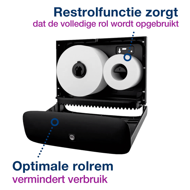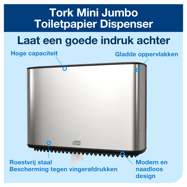 * Met de Tork mini jumbo toiletpapier roestvrij staal T2 zorg je voor uitstekende sanitaire voorzieningen. * Deze moderne, roestvrijstalen dispenser heeft een strak design en een coating tegen vingerafdrukken waardoor het schoonmaken minder tijd kost. * De slimme restrolfunctie en rolrem zorgen voor optimaal gebruik van toiletpapier en voorkomen verspilling, zodat u afval vermindert en geld bespaart. * Deze dispenser is afgesloten en dus extra hygiënisch en heeft door de hoge capaciteit weinig onderhoud nodig. * Afmeting 159 x 274 x 375mm. 1 stuk