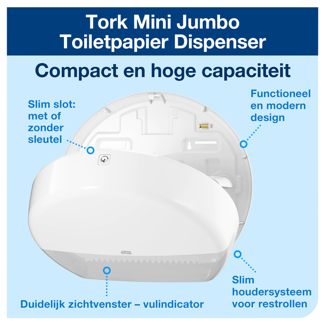 * De Tork Mini Jumbo toiletpapier dispenser T2 wit , ideaal voor toiletruimtes met gemiddeld tot hoge bezoekersaantallen, waar efficiëntie en kostenvermindering van groot belang zijn. * Door zijn hoge capaciteit hoeft het toiletpapier minder vaak bijgevuld te worden en dankzij de rem draaien de rollen niet door wat het verbruik ook vermindert. * De restrolfunctie zorgt ervoor dat de rol volledig wordt opgebruikt, zodat u minder afval heeft. * Omdat de dispeners afgesloten is, blijven de toiletrollen schoon, voor meer hygiëne en een verzorgde uitstraling naar uw gasten. * Tork Elevation-dispensers hebben een functioneel, modern ontwerp dat een blijvende indruk maakt op uw bezoekers. * De hoogglanzende behuizing van hoogwaardig kunststof is beschikbaar in het wit of zwart. * Afmeting 284 x 352 x 139mm. 1 doos x 1 stuk