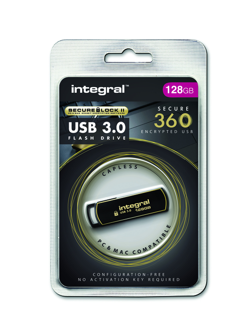 * De Integral Secure 360 USB 3.0 bevat 'Secure Lock II' 256-bit AES-coderingssoftware, zodat u onderweg waardevolle en gevoelige gegevens kunt beschermen. * 'Secure Lock II' heeft een gebruiksvriendelijke interface voor slepen en neerzetten voor on-the-fly codering voor pc en Mac. * 'Secure Lock II' 256-bit AES-coderingssoftware. * Intelligente bescherming. * Gegevens worden automatisch gewist na 10 mislukte toegangspogingen. * Aandrijving wordt vervolgens gereset en kan opnieuw worden gebruikt. * Zonder configuratie. * Secure Lock II vereist geen software-activeringssleutels voor gebruik, het werkt direct uit de doos. * Een SuperSpeed USB- flashdrive betekent dat u minder tijd hoeft te besteden aan wachten en meer tijd kunt besteden aan het genieten van uw inhoud. * Ideaal voor grote bestanden, HD-films, back-ups en het upgraden van pc-systemen. * Achterwaarts compatibel met USB 2.0-systemen.