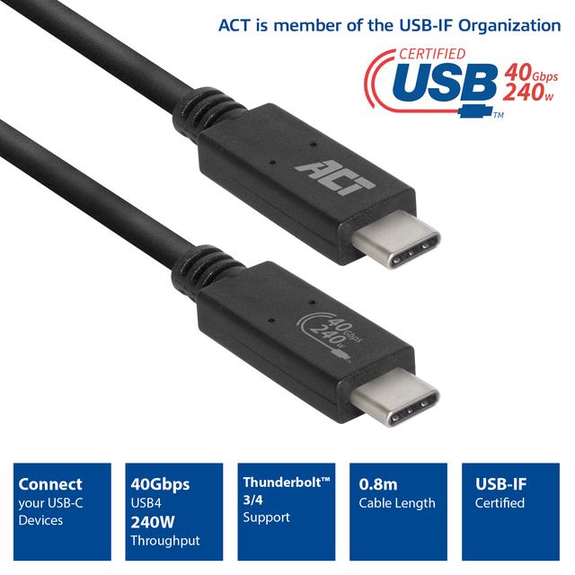 * Officieel USB-IF gecertificeerde USB4® aansluitkabel met Thunderbolt™4 ondersteuning. * Data overdrachtssnelheid tot 40Gbps. * Extended Power Range (EPR) tot 48V @ 5A = 240W. * Maximale videoresolutie: 1x 8K @ 60Hz of 2x 4K @ 60Hz. * Connectoren: C male - C male. * Kabellengte: 0,8 meter. * Overeenkomstig met Thunderbolt™3, USB 3.2 en USB 2.0 specificaties. * De AC7451 is een officieel gecertificeerde USB-C-kabel met ondersteuning van het USB4®-protocol en Thunderbolt™4. De USB4®-kabel haalt een maximale data overdrachtssnelheid tot 40Gbps en 240W door de Extended Power Range. De AC7451 ondersteunt een maximale resolutie van één 8K-monitor of twee 4K-monitoren in Daisy chain opstelling. De kabel is overeenkomstig met Thunderbolt™3, USB 3.2 en USB 2.0 specificaties. * Snelle data, stroom en video via één USB4®-kabel. De AC7451 heeft een intelligente e-marker chip. Deze chip communiceert met de aangesloten apparaten, zoals een laptop of lader, om te bepalen welke functies de kabel ondersteunt. De AC7451 kan overweg met data, stroom en video. * USB4® 40Gbps en Thunderbolt™4 ondersteuning. De AC7451 USB-C-kabel bevat de USB4®-technologie met Thunderbolt™4. De kabel ondersteunt een maximale data overdrachtssnelheid tot 40Gbps. * Power Delivery: Extended Power Range 240W. Met EPR worden er extra Power Delivery-profielen toegevoegd aan USB4®: 28V, 36V en 48V. De AC7451 bevat het 48V-profiel waardoor de kabel een maximale stroomdoorvoer van 240W ondersteunt. Kabels die voorzien zijn van SPR (Standard Power Range) ondersteunen maar 60W. * DisplayPort Alternate Mode-protocol. De USB4®-kabel ondersteunt DisplayPort Alternate Mode (DP Alt Mode) voor het distribueren van video over USB-C. De AC7451 ondersteunt een maximale resolutie van één 8K @ 60Hz monitor of twee 4K @ 60Hz monitoren in Daisy chain opstelling. * Officieel USB-IF gecertificeerd. De AC7451 is officieel gecertificeerd door USB-IF. De kabel voldoet aan de hoogste standaarden die worden gesteld door USB-IF. Het officiële USB-IF logo staat vermeld op de connector van de kabel. ACT is lid van het USB Implementers Forum, Inc. 1 stuk