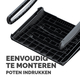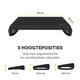 * Platform met 3 hoogtestanden voor ergonomische houding. * De poten kunnen onder het platform worden vastgeklikt wanneer ze niet worden gebruikt, zodat ze gemakkelijk kunnen worden weggeborgen. * Schommeloptie voor meer beweging en circulatie. * Draagbaar ontwerp dat gemakkelijk op te zetten, aan te passen en op te bergen is - ideaal voor hybride werken. * Modern en eenvoudig ontwerp beschikbaar in zwart en wit. * Gemaakt van 100% recyclebare materialen en om lang mee te gaan, met een garantie van 5 jaar. 1