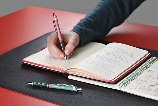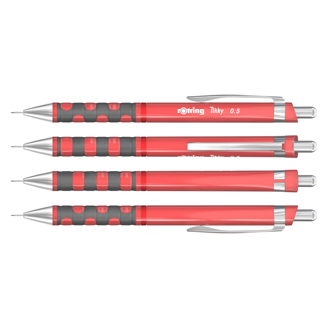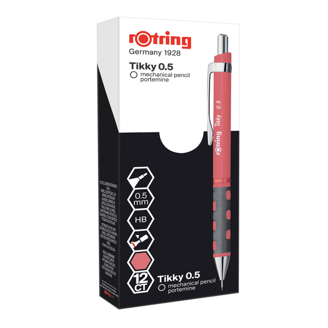 * Schets vol vertrouwen met de rOtring Tikky Mechanical Pencil 0,5. * Een messing mechanisme zorgt voor een precieze loodvooruitgang en voorkomt loodbreuk, zodat elke lijn die je maakt scherp en duidelijk is. * De soft touch rubberen grip en het lichtgewicht driehoekige vat zorgen voor uitzonderlijk comfort. * Potloden zijn verkrijgbaar in nieuwe levendige kleuren voor een edgy, eigentijdse look. * Kleur van deze tikky is old rose.