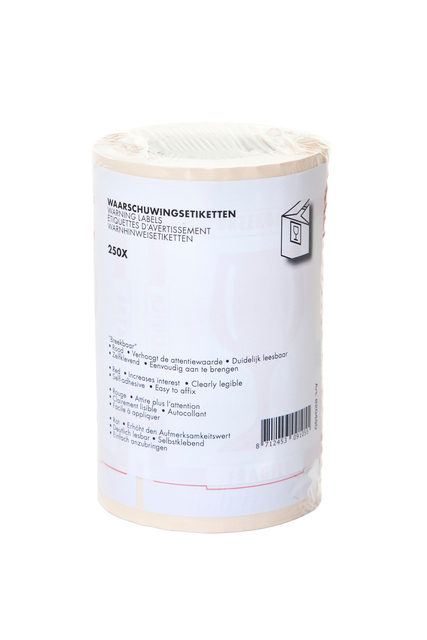 * Opvallend waarschuwingsetiket markeert en beveiligd speciale objecten en/of gebieden. * 80mm x 100m. * 250 etiketten op rol. * In 4 talen. 1 rol x 250 stuk
