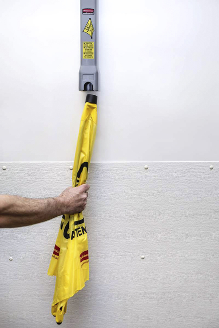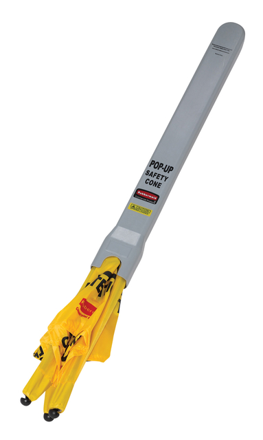 * Driezijdige Rubbermaid waarschuwingskegel met tekst in het Engels, Frans en Spaans. * Opvouwbaar en compact op te bergen aan de muur. * Vouwt automatisch open.