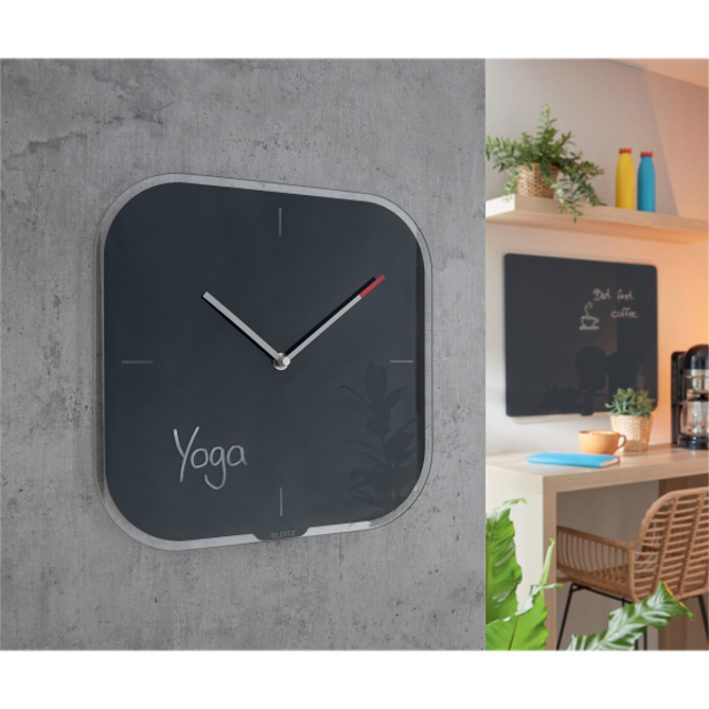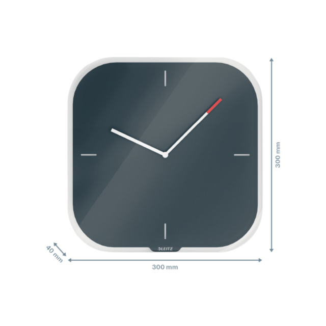 * De Cosy Stille Glazen Wandklok is ideaal voor kantoren, leesruimtes en slaapkamers, zodat je niet gestoord wordt door het geluid van de tikkende klok. * Deze moderne klok van topkwaliteit is de perfecte aanvulling op jouw (thuis)kantoor om ervoor te zorgen dat je de hele dag ontspannen en productief blijft. * Inclusief een droog uitwisbare marker om afspraken of aantekeningen mee op te schrijven. * Moderne, vierkante analoge wandklok . * Stil quartz-klokmechanisme, zodat je niet wordt gestoord door het tikken van de klok. * De klok is gemaakt van 4 mm gehard veiligheidsglas met ultragoede uitwisbaarheid, hoge weerstand tegen krassen en deuken.* Minimalistische opmaak van de wijzerplaat zorgt ervoor dat je jouw eigen afspraken kunt noteren met de meegeleverde marker. * De minuutwijzer heeft een rood accent wat net dat beetje extra geeft. * Eenvoudig aan de muur te bevestigen met de haak aan de achterkant van de klok. * Werkt met 1 x AA batterij (niet inbegrepen) . * Past perfect bij de Cosy Glasborden. * Plasticvrije verpakking. * De Cosy Range van Leitz combineert comfort in huisstijl met eersteklas kwaliteit om een positieve en productieve werkomgeving te creëren. * Afmetingen: 300x40x300mm.