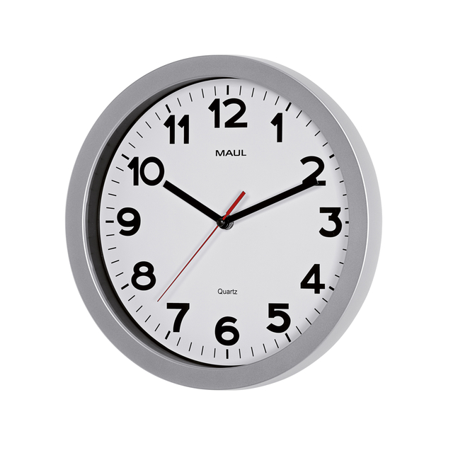 * De MAUL Step, 30cm Q, is een populair model binnen onze serie wandklokken, geleverd in een aantrekkelijk en strak design. * Leverbaar met een doorsnee van 20, 30, 35 en 40 cm. * Moderne rand van hoogwaardig kunststof. * Cijfers duidelijk leesbaar. * Stijlvolle uitstraling voor in kantoor of bij u thuis. * Wandklok afgewerkt met mineraalglas voor bescherming van de wijzerplaat. * Werkt op één 1,5 V AA batterij, deze is bijgesloten. * Eenvoudige montage d.m.v. ophangoog. * Universeel te gebruiken in kantoren, spreek- en wachtkamers, ontvangsthallen, werkplaatsen of thuis. * De Step is een robuust standaardmodel met een stijlvol zilver frame, slagvast kunststof. * Dit model 9053195 is uitgevoerd als Quartz klok, deze zijn functioneel in gebouwen waar het radiosignaal lastig of niet te ontvangen is, uiteraard moet deze klok handmatig op de juiste tijd ingesteld worden. * Bijkomend voordeel van een Quartz klok is dat de wijzers (klok) stildraaiend is. * Kies bewust de wandklok die het beste bij uw praktijk situatie past.