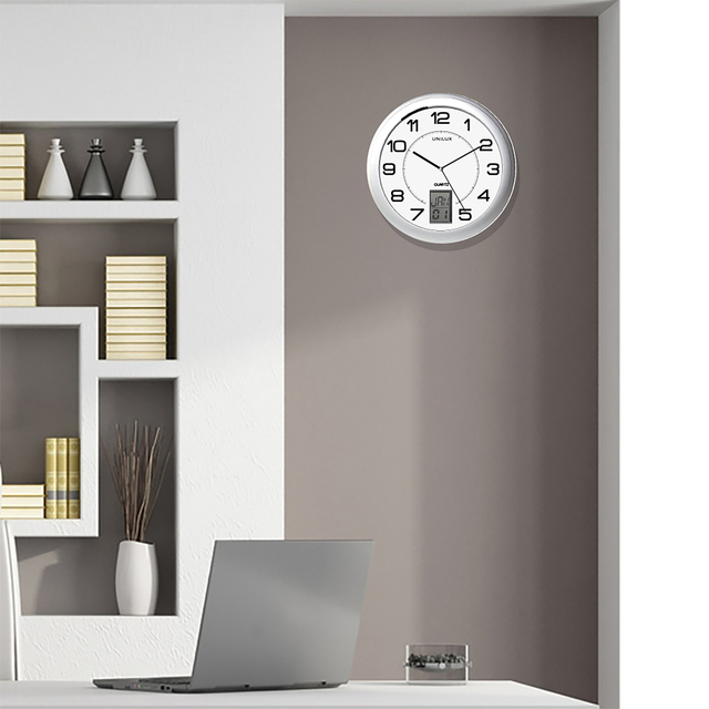 * Deze klok is een perfecte aanvulling op de Unilux LED-lampen en kantooraccessoires en past in elk kantoor.* Eigentijds design: met metallic grijze rand en digitale datum weergave. * Slim: een digitaal display is ingebouwd in de wijzerplaat en kan worden weergegeven in: dag / datum, datum / maand of uur / minuten. * Precisie : Quartz uurwerk van hoge kwaliteit, slechts 1 seconde afwijking in 6 jaar. * Snelle wandmontage met 1 ophangoog. * Gemiddeld verbruik: 0,14 mA. * Inclusief 1 AA 1,5v batterij. * Diameter: 30,5 cm. * Dikte: 4cm. * Materiaal: plastic wijzerplaat met glazen bescherming. * 2 jaar garantie. * De klok is niet geluidloos. 1 stuk