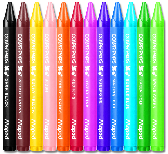 * Maped waskrijt Color'Peps Wax: 12 krijtjes met heldere kleuren. * De krijtjes zijn voorzien een van papieren wikkel zodat de handen niet vuil worden. * In een kartonnen etui.