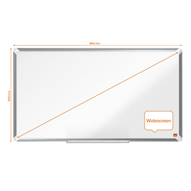 * Widescreen formaat magnetisch emaille whiteboard. * Oppervlak biedt een superieur niveau van uitwisbaarheid voor regelmatig gebruik. * Voorzien van een modern, stijlvol aluminium frame. * Bevestigd aan de wand door traditionele hoekmontage. * Een ruime pennengoot voor handige opberging van whiteboard markers en wissers. * Geleverd met een Nobo whiteboard marker. * 25 jaar garantie op het oppervlak. * Formaat: 890x500mm.