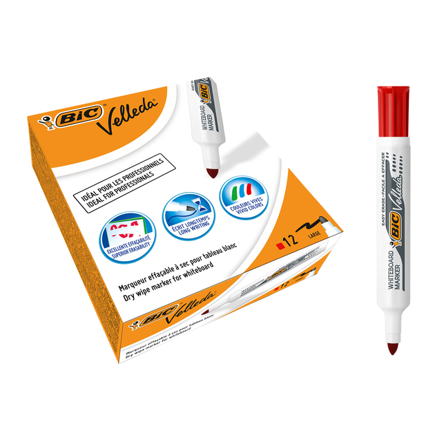 De BIC Velleda 1711 Whiteboard viltstift markers zijn het perfecte gereedschap voor indrukwekkende presentaties op whiteboards. Ze zijn speciaal voor op kantoor en school ontwikkeld. De stevige vastgezette acrylkogelpunt (0,6 mm) zorgt voor brede lijnen van 1,9 mm. De pigmentinkt garandeert levendige kleuren in combinatie met uitstekende uitwisbaarheid. Lange levensduur dankzij het grote inktreservoir. Compromisloze kwaliteit is gegarandeerd want deze dry erase board markers worden in BIC's eigen fabrieken geproduceerd, op basis van de ongeëvenaarde expertise van het bedrijf.