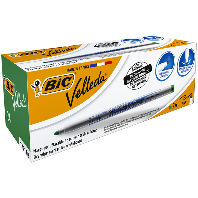 * Whiteboardstift op alcoholbasis. * Droog afwisbaar. * Heldere kleuren. * Dop in schrijfkleur. * Neutrale geur. * Duurzame geblokkeerde fijne punt. * Penmodel. * Schrijfbreedte 1,6mm - puntdikte 2.8mm. * PVC vrij. 24 stuk