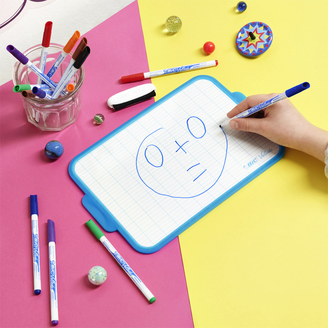 * Whiteboardstift op alcoholbasis. * Droog afwisbaar. * Heldere kleuren. * Dop in schrijfkleur. * Neutrale geur. * Duurzame geblokkeerde fijne punt. * Penmodel. * Schrijfbreedte 1,6mm - puntdikte 2.8mm. * PVC vrij. 24 stuk