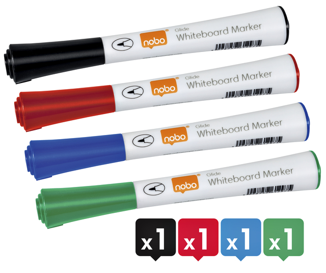 * Nobo Glide whiteboardmarkers. * Ligt goed in de hand. * Markers voor whiteboarden en flipovers. * Met ronde punt. * Schrijbreedte 1mm. 1 blister x 4 stuk