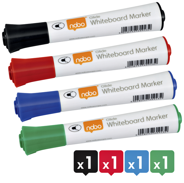 * Nobo Glide whiteboardmarkers. * Ligt goed in de hand. * Markers voor whiteboarden en flipovers. * Met ronde punt. * Schrijbreedte 3mm. 1 blister x 4 stuk