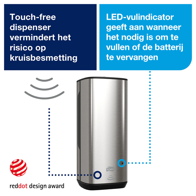 * De Tork Zeepdispenser met Intuition Sensor van roestvrij staal is een gebruiksvriendelijke dispenser voor jong en oud. * De moderne hightech look van de automatische dispenser laat een blijvende indruk achter bij uw gasten. * Reinigen is eenvoudig. * Dankzij de speciale anti-vingerafdrukcoating ziet het roestvrij staal er in een mum van tijd weer blinkend uit. * Ook onderhoud kost weinig tijd. * De dispenser laat zich eenvoudig vullen met schuimzeep en vloeibare zeep, maar ook met vloeibare alcohol en alcoholgel voor handdesinfectie. * Afmeting 302 x 134 x 148mm. 1 stuk